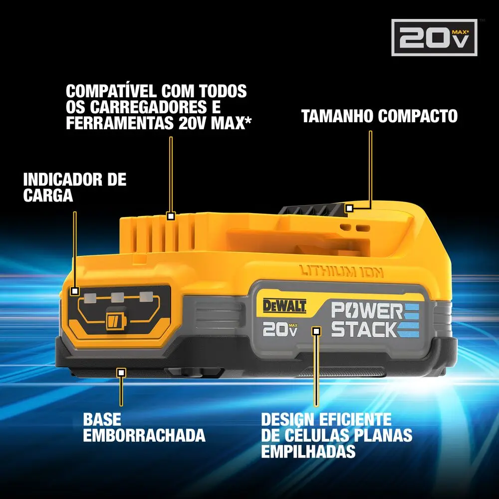 Projetada para suportar uso intenso, proporciona maior durabilidade e eficiência, sendo ideal para profissionais que exigem confiabilidade em ferramentas sem fio. Seu design compacto facilita o acesso a áreas de difícil alcance e reduz a fadiga do operador, tornando o trabalho mais ágil e confortável. A ausência de efeito memória permite recargas a qualquer momento sem perda de desempenho. Compatível com todas as ferramentas da linha Dewalt 20V MAX, a DCBP034-B3 é a escolha perfeita para quem busca máxima performance, portabilidade e inovação.