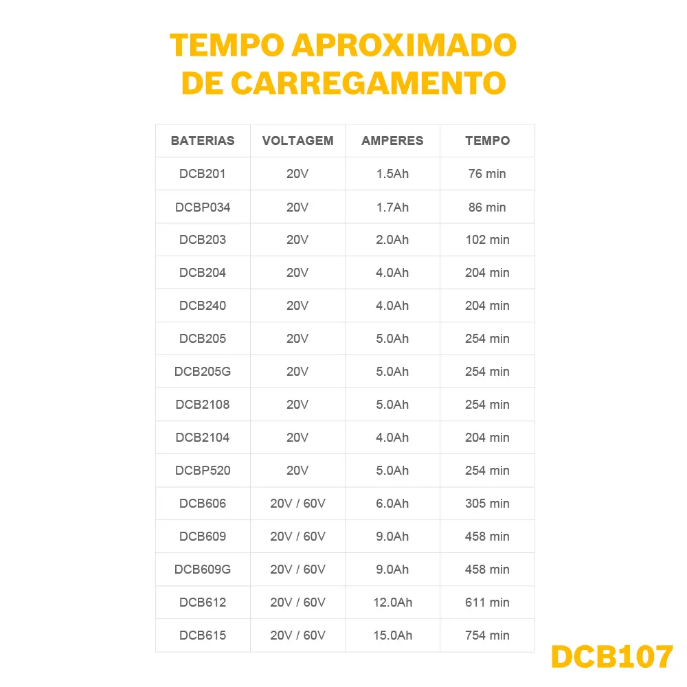 | Incluso | 1 Manual de instruções 2 Baterias 20V MAX* Li-ion 2.0 Ah (DCB203) 1 Carregador Bivolt (DCB107) |