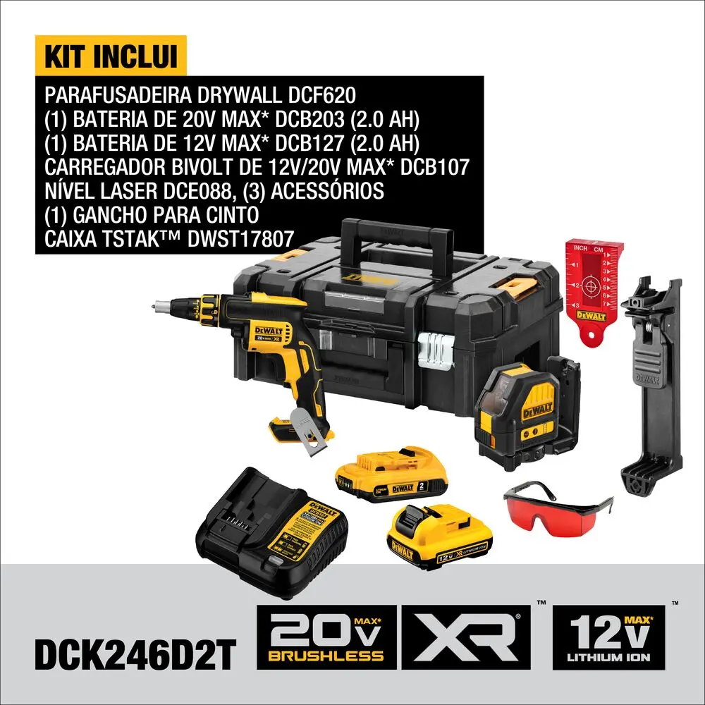 Kit Dewalt DCK246D2T, Parafusadeira Drywall DCF620 + Nível Laser DCE088