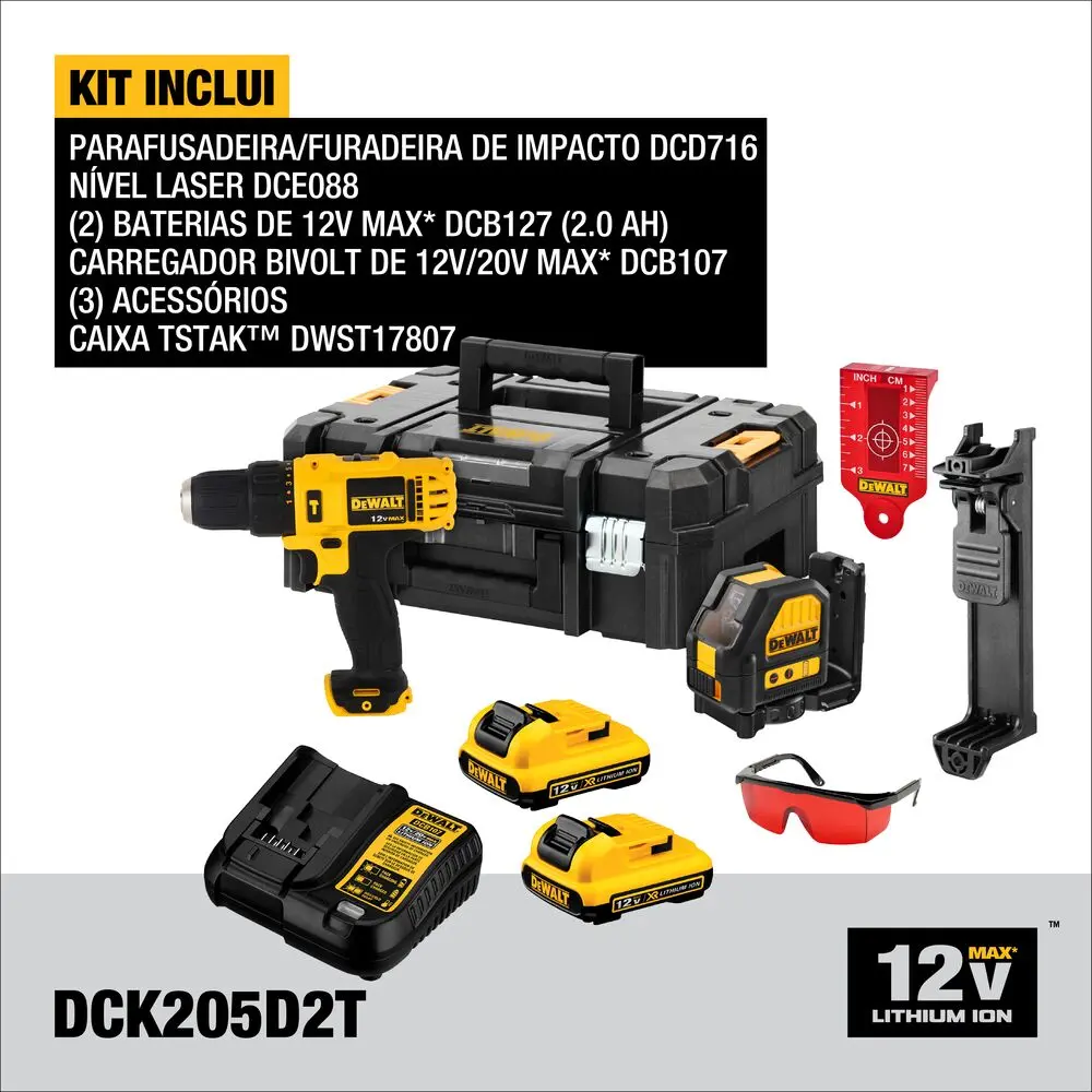 Kit Furadeira e Paraf. de Impacto Dewalt 12v + Nível a Laser DCK205D2T